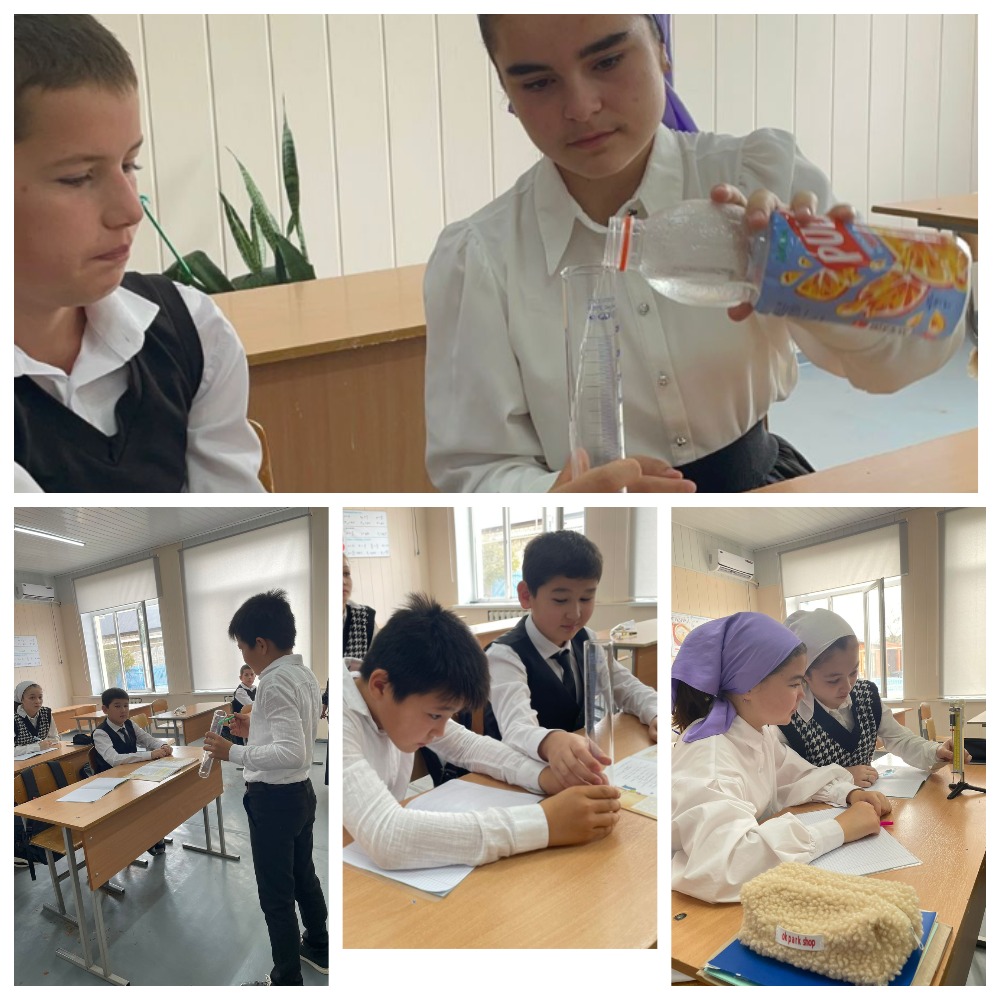 В 7 классе проводилась лабораторная работа "Определение цены деления прибора и измерение объёма жидкости". Цель данного урока заключалась в следующем: "Научить учеников определять цену деления прибора и измерять объём жидкости» Учащимся было дано задание, измерить объём жидкости в разных сосудах. По причине того, что это одна из первых лабораторных работ по программе у учеников возникли трудности на начальном этапе эксперимента. Но в целом урок прошёл успешно. Данная работа понравилась учащимся, так как работа была довольно простая и не требовала сложного оборудования и приборов. Дети были довольны такой формой проведения урока, они почувствовали себя в роли открывателей.