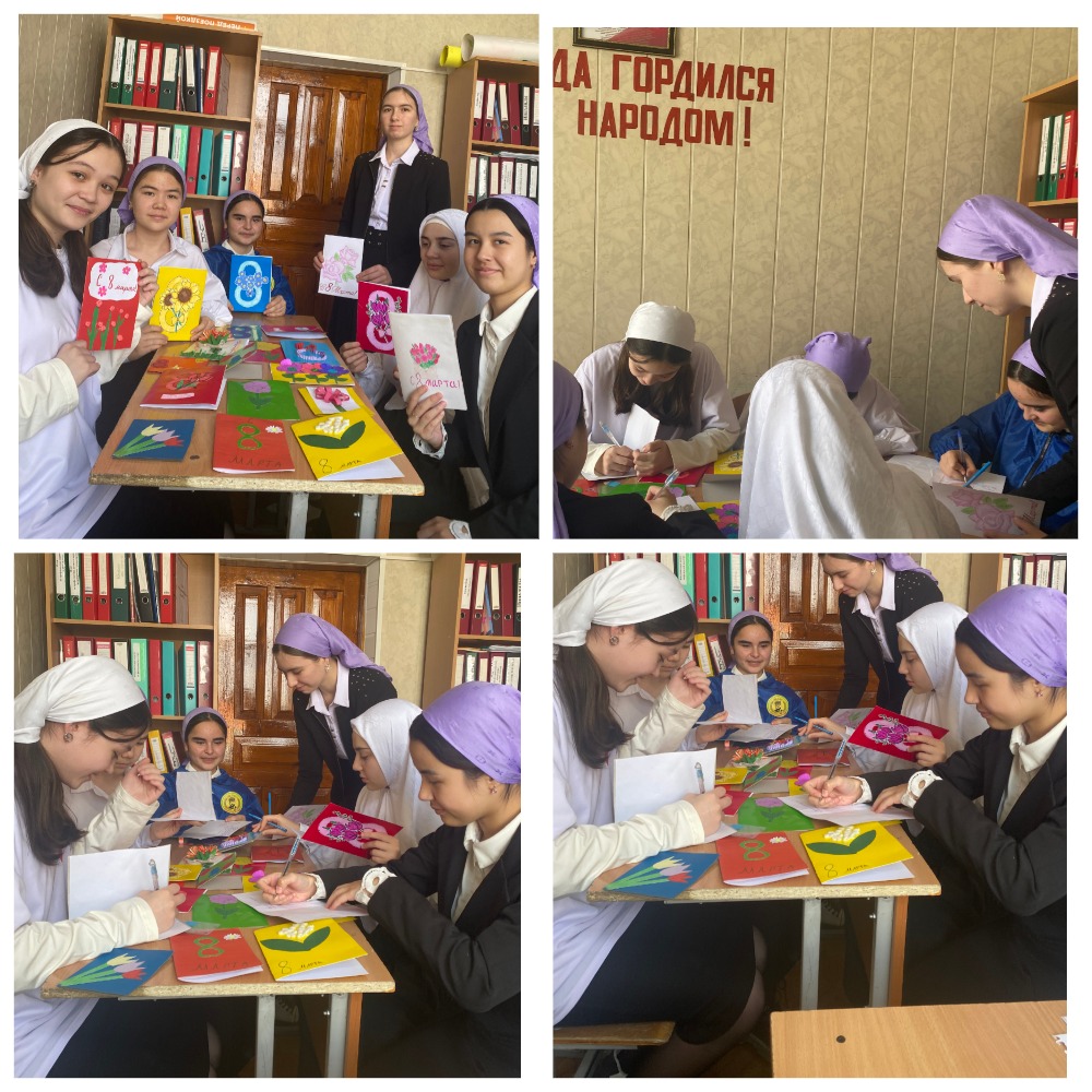 В ходе мастер-класса дети изготовили праздничные открытки из цветной бумаги, картона, бархатной бумаги и атласных лент. Девочки вложили в неё всё своё мастерство, любовь к родным людям. ученики не только вырезали, клеили, но и рассказывали о дорогих, родных, любимых мамах и бабушках.